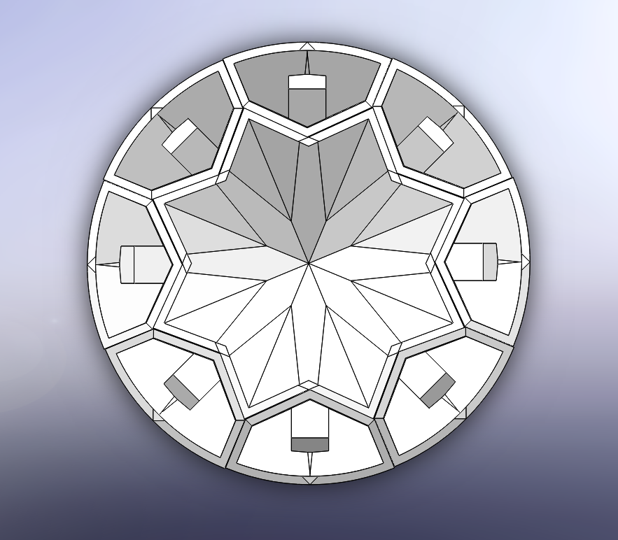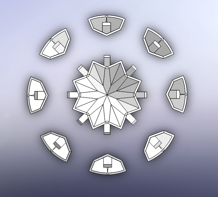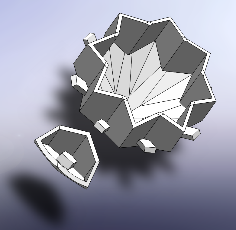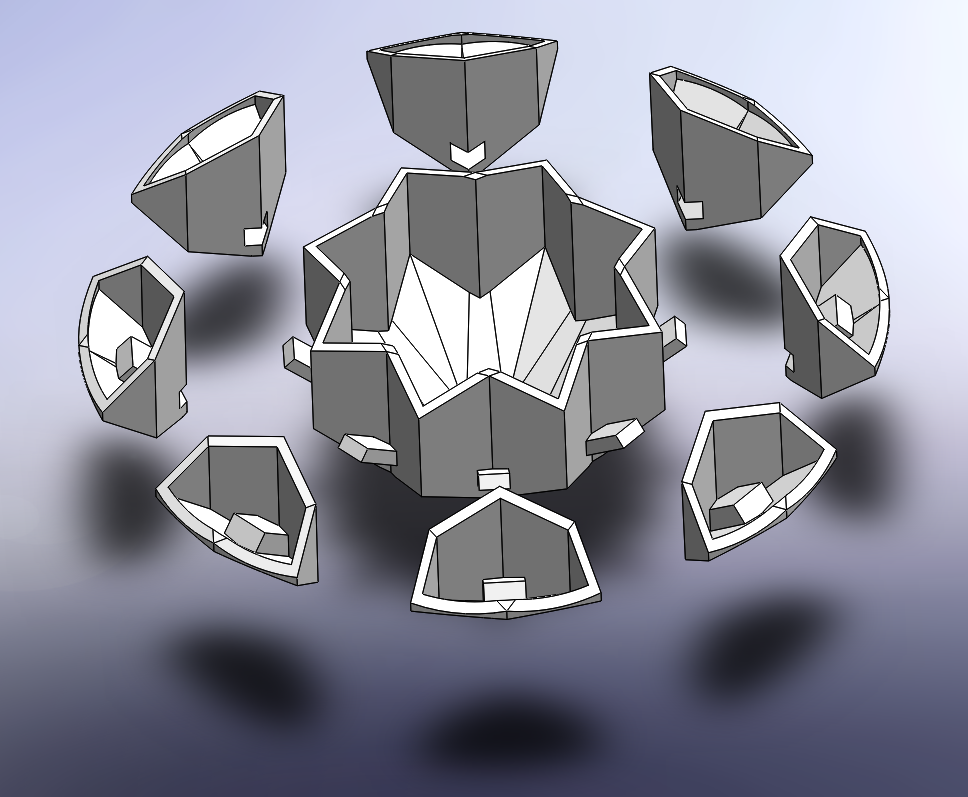 Each facet is its own mini modular plant pot attached to the larger main plant pot in the center. The small facet pots slide down onto the pegs of the main pot at the angle so that they don't slip off. The smaller propagated plants don't require as much soil so the main mass of the pot is the central mother plant’s pot.