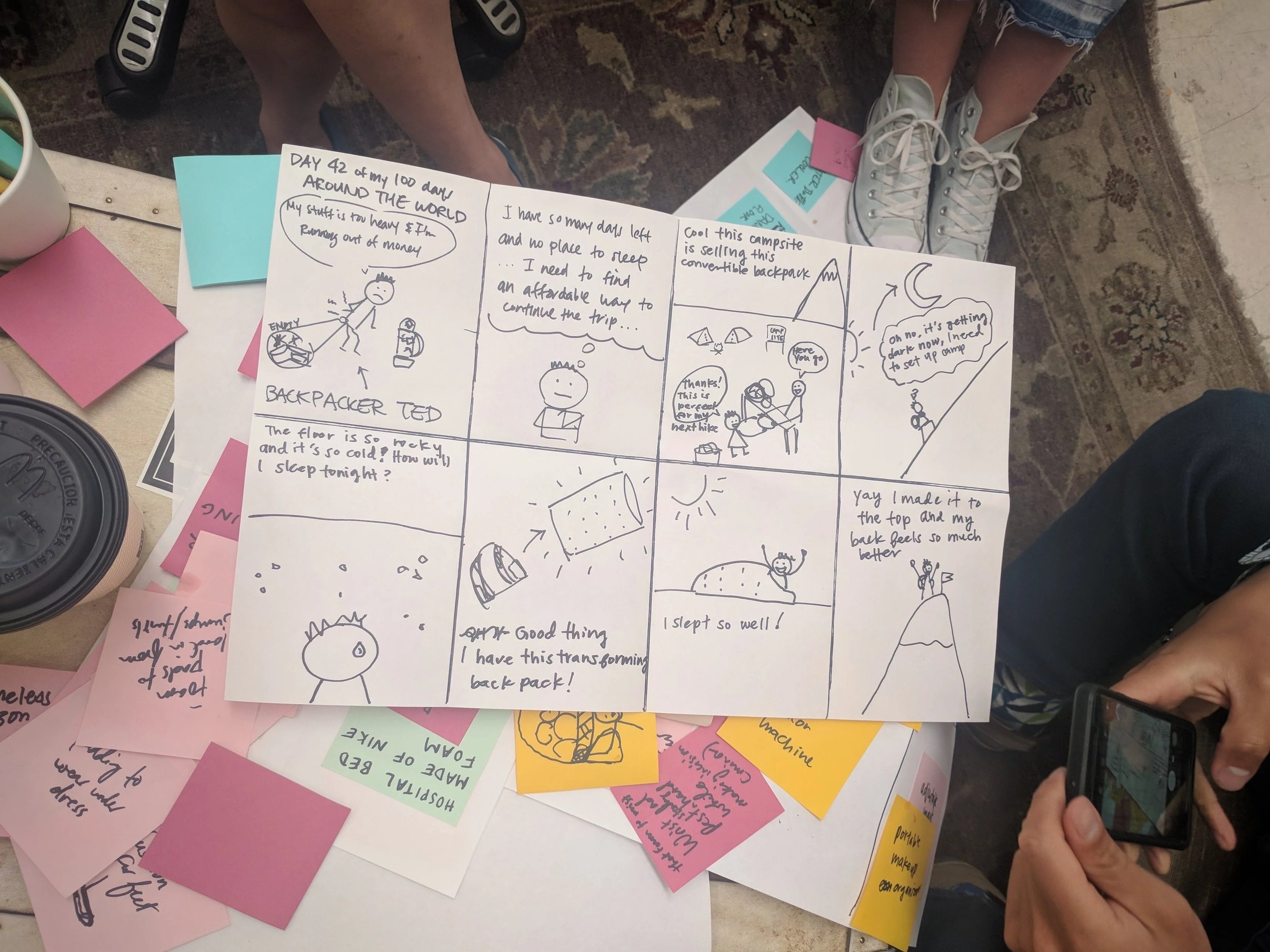 We got put into groups and started brainstorming ideas for what we could use the materials for. We really wanted to do something that could both be used for typical consumers but also be helpful for the homeless population. I started thinking about backpacking and with my group, we eventually went with a backpack that could come apart and reassembled into a sleeping pad. I was able to use the provide material samples to create our super quick prototype of the rollable backpack bed. We storyboarded for our typical consumer (a long distance backpacker) and also wanted to do a donation of one backpack for every one sold. Our bit of innovation was that the straps would also be able to be detached and reassemble to the body of the backpack to extend the length of the sleeping bag/bed.